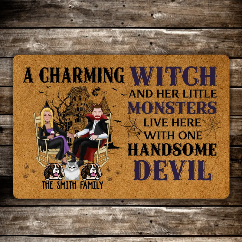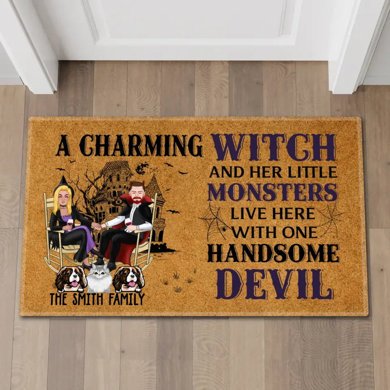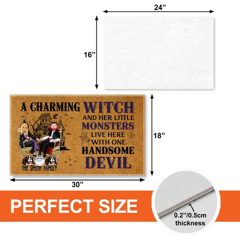 A Charming Witch and Her Little Monsters Live Here with One Handsome Devil – Personalized Gifts Custom Halloween Doormat for Fur Family, Dog Cat Lovers perfectly reflects the spirit of a fun, pet-loving home. Add each pet’s name for a heartwarming and funny touch. Built with weather-resistant material, it’s ideal for both porch and indoor use. Celebrate Halloween while keeping your home welcoming and full of personality.