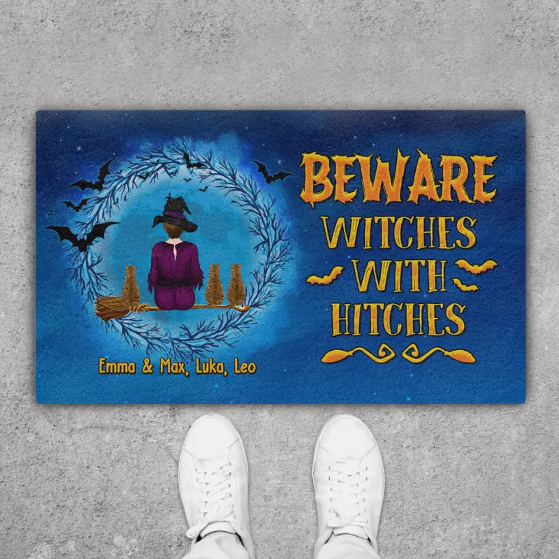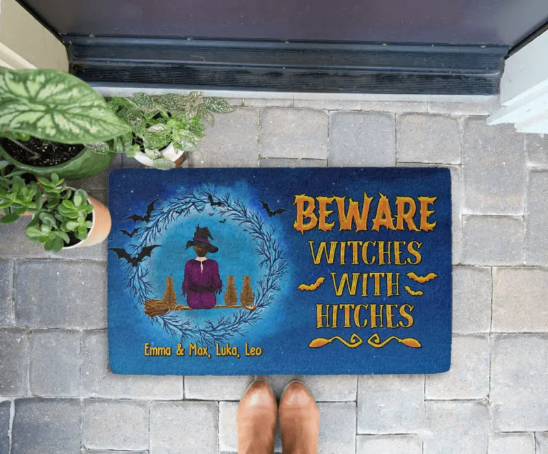 Beware Witches With Hitches – Personalized Gifts Custom Halloween Doormat For Witches For Her, Cat Lovers is a hilarious way to greet guests while showing off your witchy personality. Ideal for cat moms and Halloween fans, this doormat can be customized with your name or your feline’s. Crafted from sturdy materials, it stands up to foot traffic and weather. Whether at your front door or inside your home, it adds magical charm. This unique gift makes every visitor smile and is perfect for those who live for spooky season all year long.