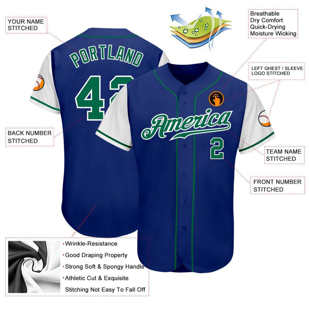 The Custom Royal Kelly Green-White Authentic Two Tone Baseball Jersey is designed for those who love bold color combinations with a sports fashion twist. Featuring a royal blue base paired with kelly green and white panels, this jersey delivers a striking two-tone design that stands out in any crowd. Lightweight and breathable, it’s perfect for athletic activities, outdoor events, or everyday streetwear. The durable construction ensures long-lasting quality, while its versatile design allows you to pair it with casual or sporty outfits. For fans of athletic fashion tops and urban sportswear, the Custom Royal Kelly Green-White Authentic Two Tone Baseball Jersey is an essential choice. It’s a bold yet functional piece that captures both energy and individuality.