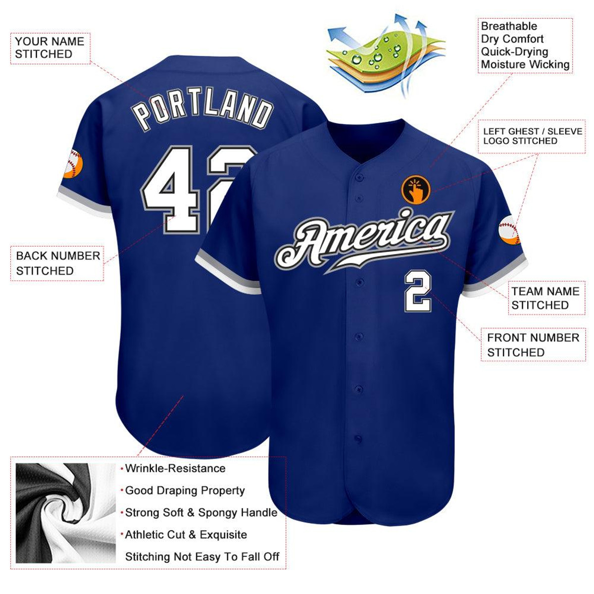 The Custom Royal White Black-Gray Authentic Baseball Jersey delivers sleek, versatile style for sports and streetwear. Featuring a royal base with sharp white highlights and black-gray contrasts, it creates a bold yet understated look. Crafted from durable, breathable fabric, this jersey ensures comfort and performance for training, casual outings, or relaxed weekends. Its authentic baseball cut adds timeless appeal while maintaining a modern edge. Whether worn for athletic use or fashion-forward styling, the Custom Royal White Black-Gray Authentic Baseball Jersey offers a strong balance of tradition and trend.