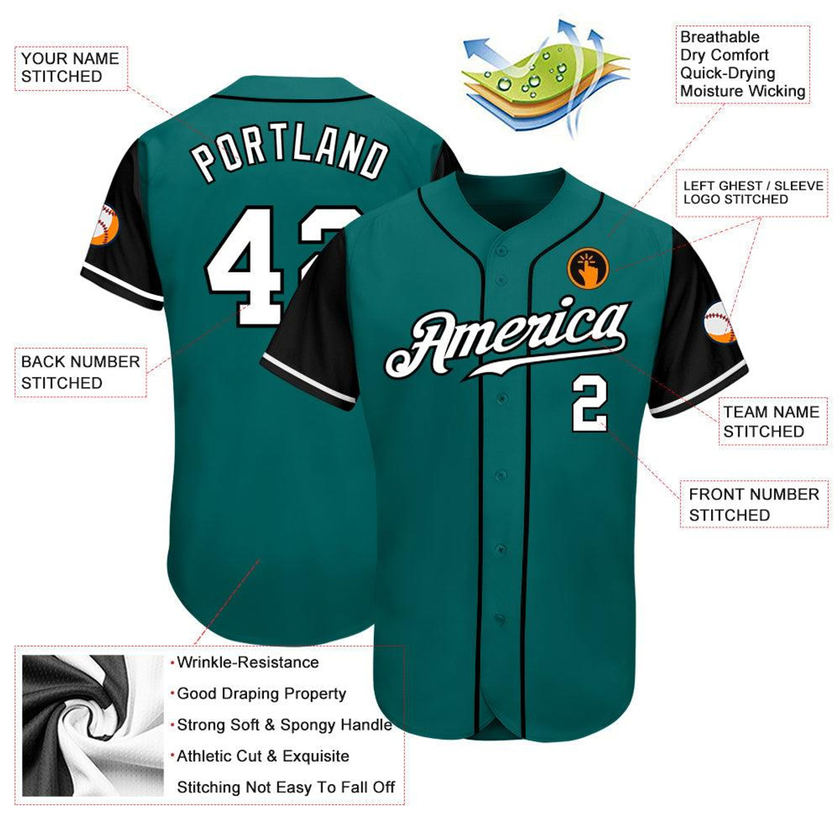 Bold and striking, the Custom Teal White-Black Authentic Two Tone Baseball Jersey contrasts a teal base with crisp white and black for a powerful look. Designed with premium fabric, it delivers breathable comfort and reliable durability whether worn for athletics or lifestyle wear. Its authentic cut ensures a timeless silhouette, while the two-tone palette adds a sleek, modern edge. Easy to pair with jeans, joggers, or shorts, the Custom Teal White-Black Authentic Two Tone Baseball Jersey is versatile and fashion-forward.