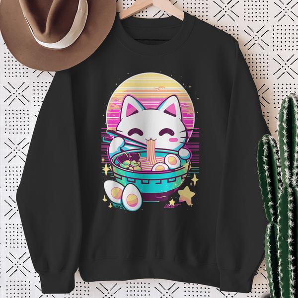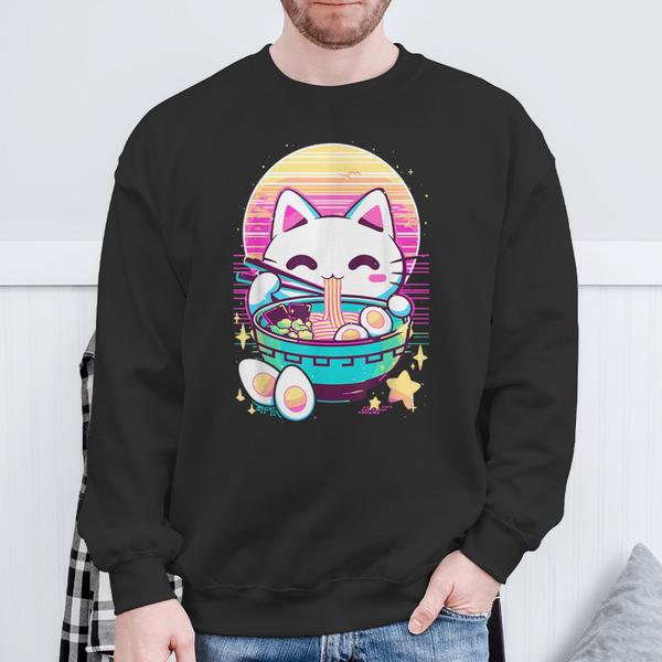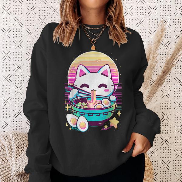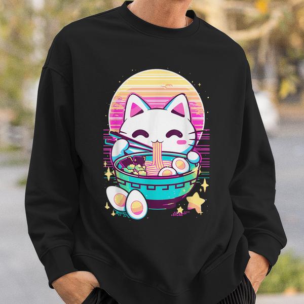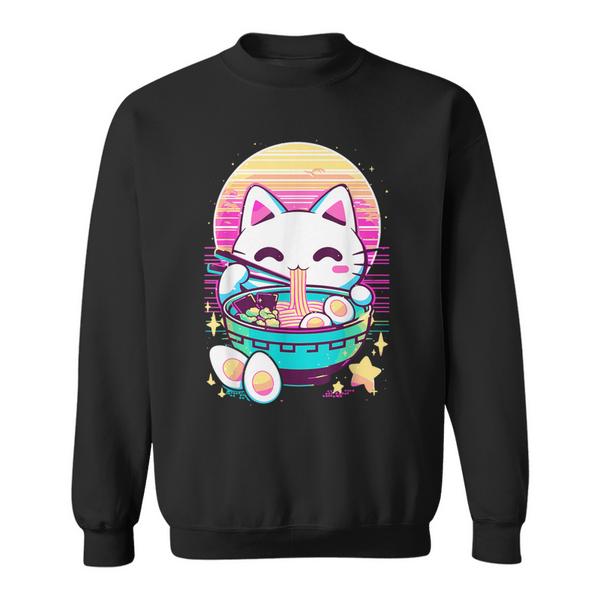 Cute Anime Foodie Sweatshirt – Anime Cat Eating Ramen Japanese Ramen Cat Japan Sweatshirt