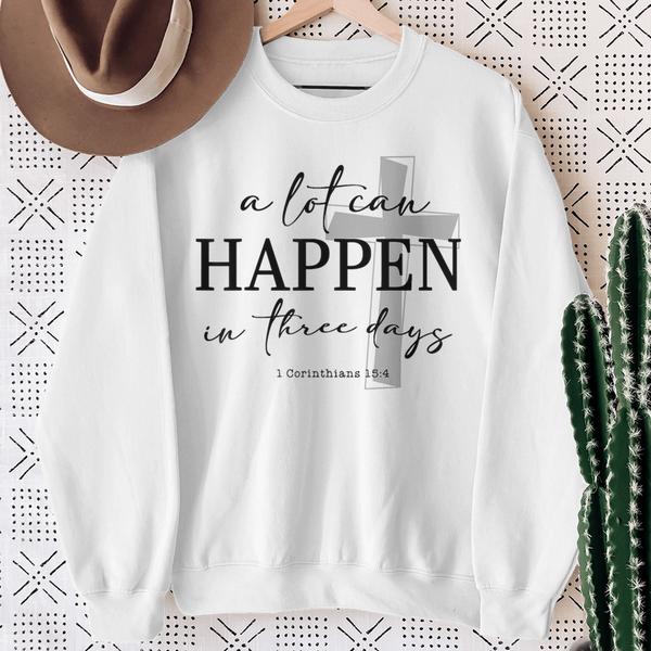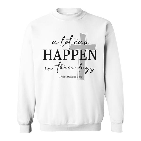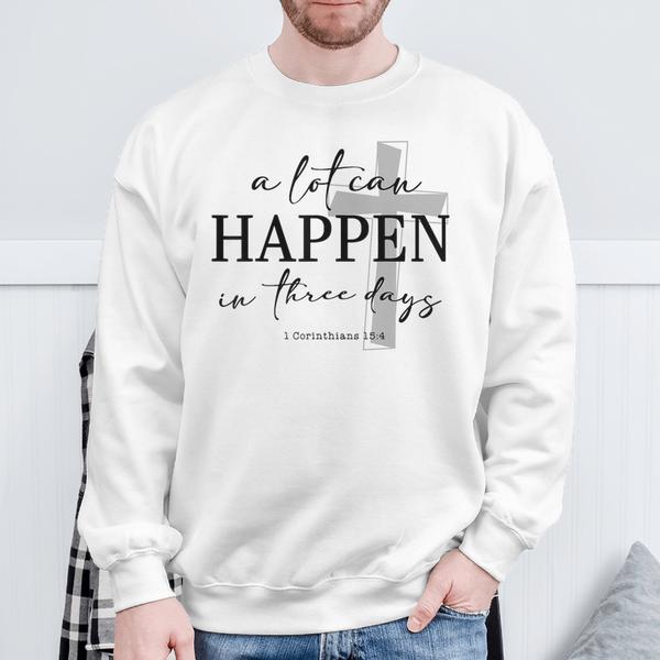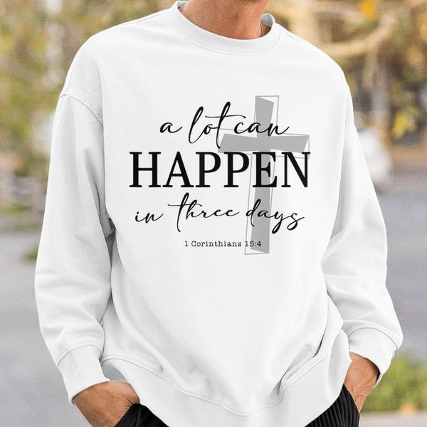 Share your faith with the A Lot Can Happen In Three Days Sweatshirt. This Faith Inspired Sweatshirt captures the powerful message of resurrection and hope. With its simple yet impactful design, it’s great for church gatherings, Easter celebrations, or daily inspiration. Soft, durable, and meaningful — it’s a constant reminder of faith and renewal.
