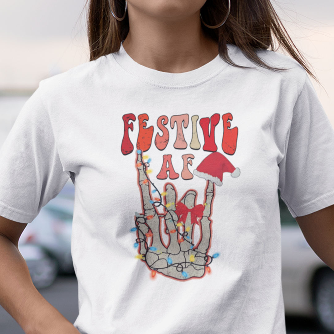 Stand out this season with the Festive AF Shirt Skeleton Middle Finger Light Tee! Tailored for the free-spirited individuals who appreciate humor and a touch of sarcasm, this tee combines festive vibes with a bold, striking skeleton design. Perfect for holiday parties, gatherings with friends, or simply making a statement during festive outings. Made from soft, breathable fabric, it’s comfortable enough for all-day wear while showcasing your unique personality. Whether you’re looking to make a statement at a holiday bash or simply want to express your fun side, this shirt is an ideal choice for the adventurous trendsetter. Grab your Festive AF Shirt Skeleton Middle Finger Light Tee today and step into the spotlight!