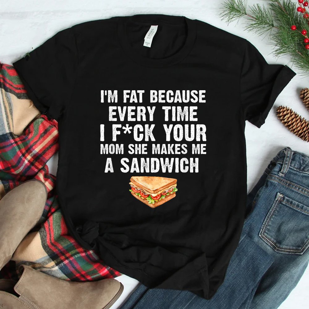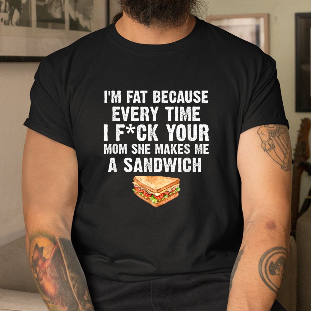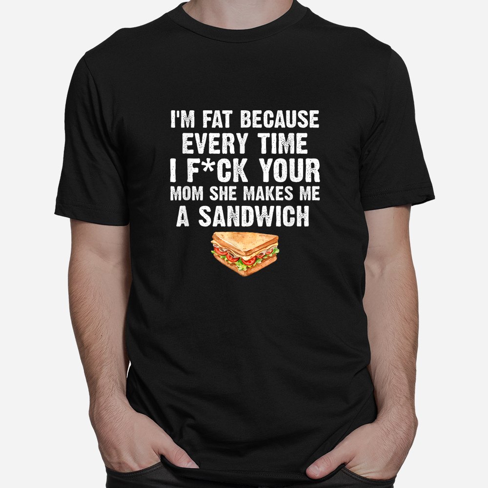 The Im Fat Every Time I F Ck Your Mom She Makes Me A Sandwich Shirt is a bold and humorous adult tee. Made from soft, breathable cotton, it’s designed for comfort while making a strong statement. Perfect for gag gifts, novelty parties, or casual settings with friends who appreciate edgy humor, this shirt combines fun and shock value. Its durable print ensures lasting visibility and laughter. This attention-grabbing shirt is ideal for anyone who enjoys adult novelty apparel that sparks conversation and keeps humor front and center.