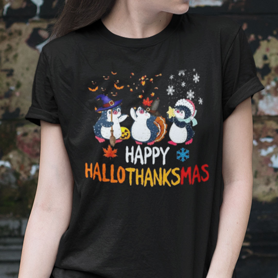 Get ready to spread joy this holiday season with the adorable Happy Hallothanksmas Penguin Shirt. Designed for festive enthusiasts who cherish Halloween, Thanksgiving, and Christmas, this shirt merges fun and style. The charming penguin design is not just a nod to the winter holidays but also a great conversation starter at family gatherings and holiday parties. Made from comfortable, high-quality fabric, it’s perfect for those cozy celebrations or casual outings. Whether you’re decking the halls or hosting a feast, this shirt is sure to add a touch of humor and warmth to your festive wardrobe. Embrace the spirit of the season with this must-have holiday apparel that is sure to become a favorite among family and friends!