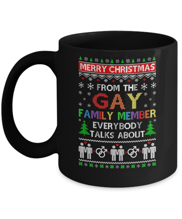 Embrace the holiday spirit with our LGBT Merry Christmas From Gay Family Ugly Christmas Sweater Mug. Specifically designed for the LGBTQ+ community, this charming mug is perfect for sipping cocoa at festive gatherings or showcasing your pride. The playful ugly sweater design brings a smile, making it an ideal gift for your friends or family who love to celebrate diversity this season. Whether you’re exchanging gifts or enjoying a cozy evening at home, this mug is a delightful reminder of love and acceptance. Celebrate togetherness and cherish those special moments with this unique holiday treasure that not only serves a purpose but also spreads joy.