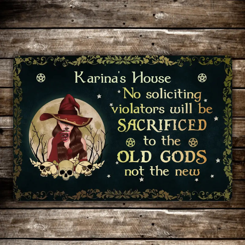 Witches, beware — the No Soliciting Violators Will Be Sacrificed to the Old Gods doormat brings bold humor and mystical energy to any home. Perfect for Halloween lovers, witches, and fans of dark humor, this custom doormat turns your entryway into a playful sanctuary. Crafted with premium coir and backed with durable rubber, it’s ready for outdoor or indoor use. The message mixes pagan wit and modern sarcasm, ideal for those who love their privacy with a touch of mystery. Personalize it with a name or phrase to make it distinctly yours. Whether for Halloween décor or everyday fun, it’s the perfect blend of spooky, spiritual, and stylish.